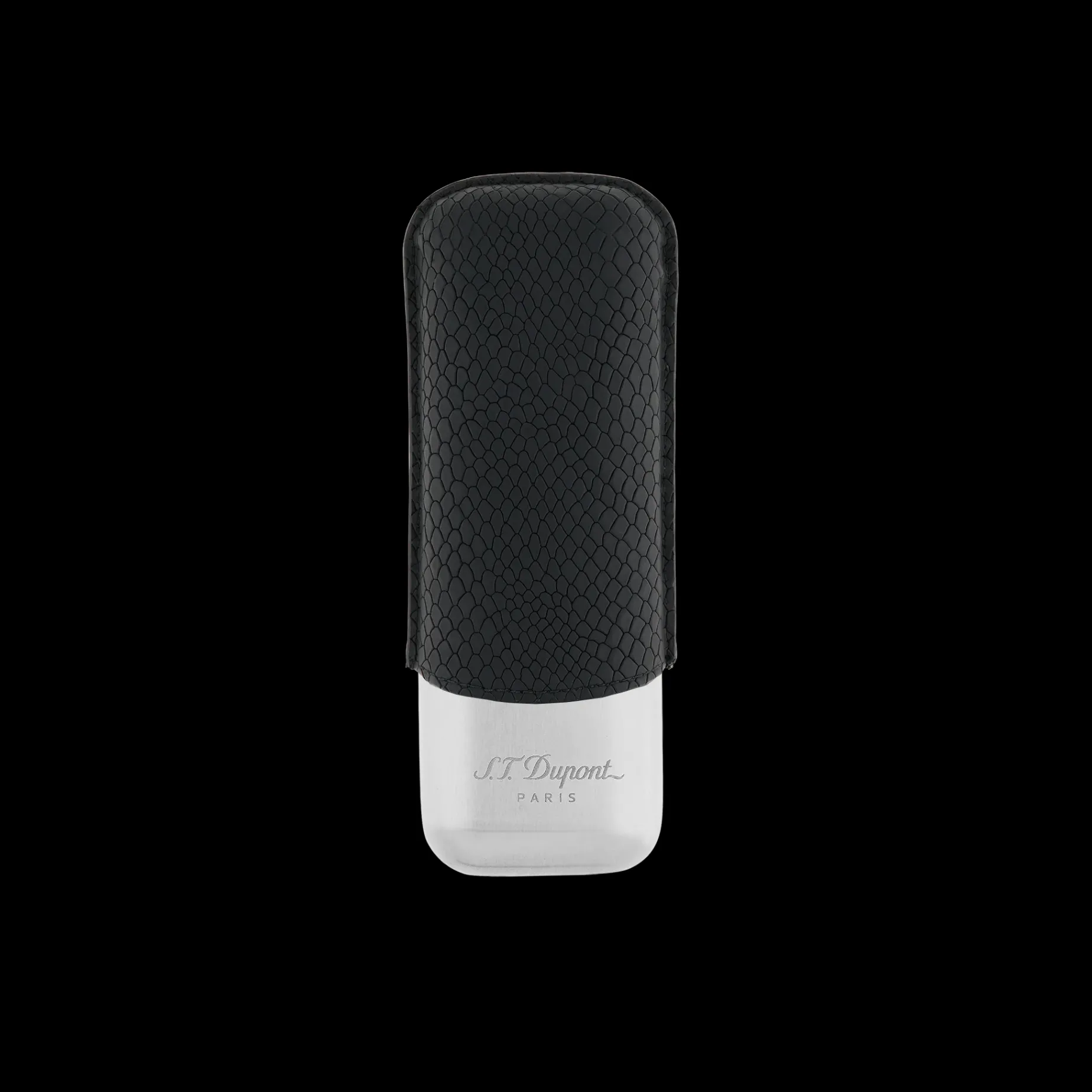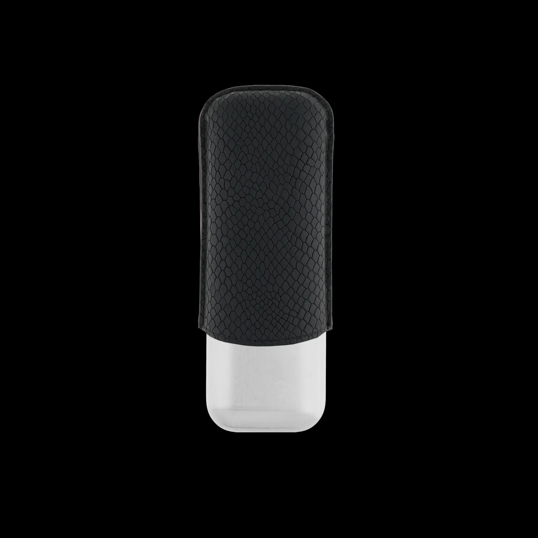 Black calf leather cigar case for 2 cigars with a scale effect and silver metal base.