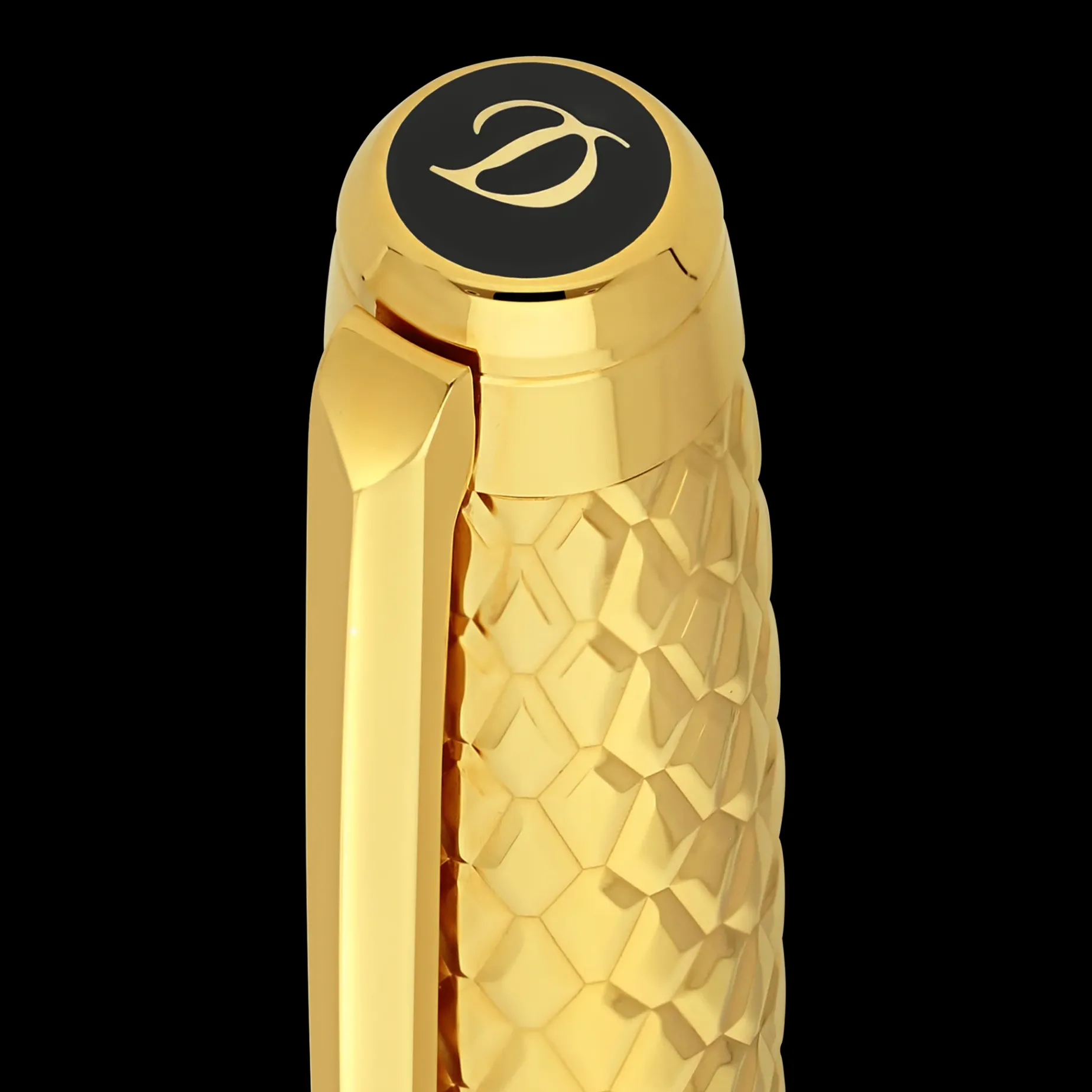 The Line D Eternity Large is adorned with a guilloche dragon scale cap and gold plated finishes, as well as a guilloche lacquered Dupont body in honey color. This writing instrument Line D Eternity Large is offered with a roller sleeve and is manufactured in our workshops in Faverges, France. Associated refills: 040840 Blue 040841 Black
