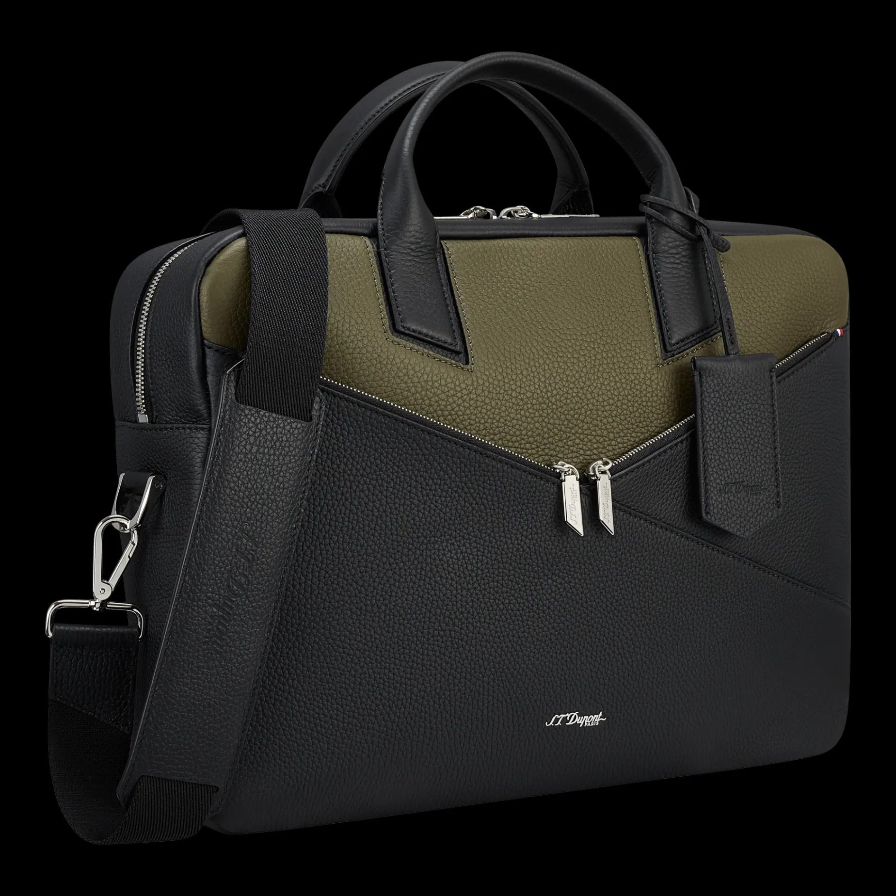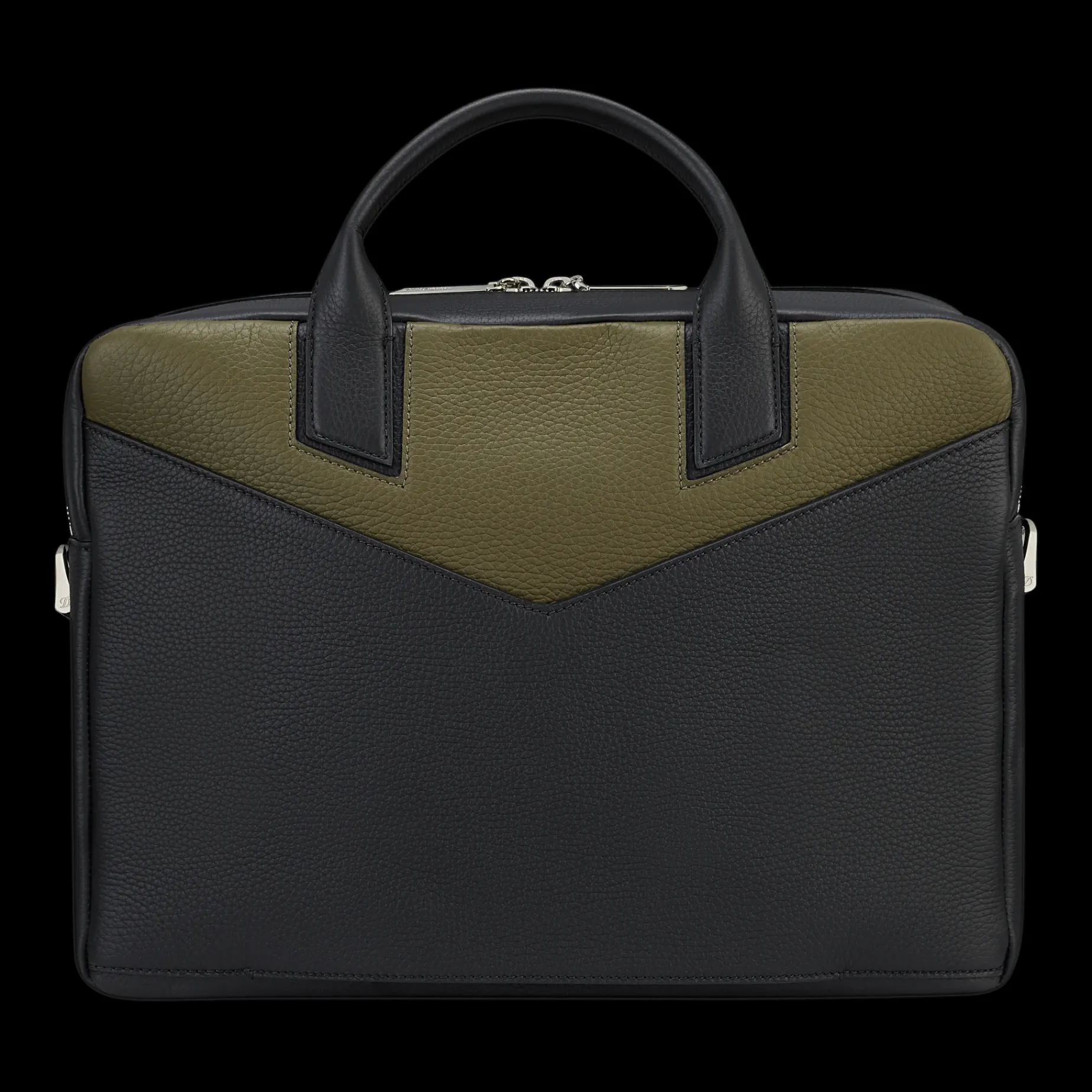 Neo Capsule Document Holder. Grained bicolor calf leather in khaki green and black. Spacious interior: it can hold A4 documents, an iPad or a laptop, as well as a multitude of other items. All products from the grained Neo Capsule collection are LWG certified.