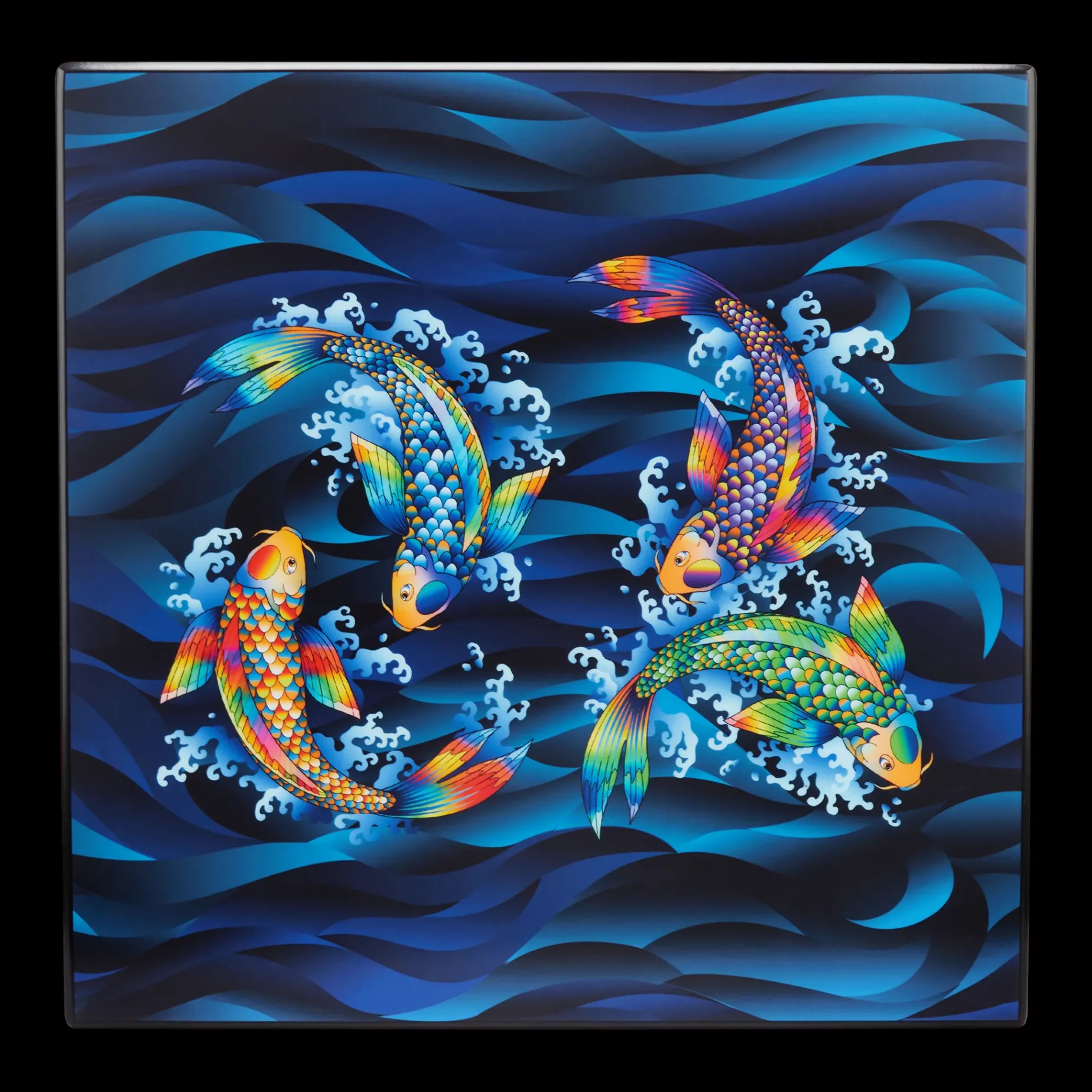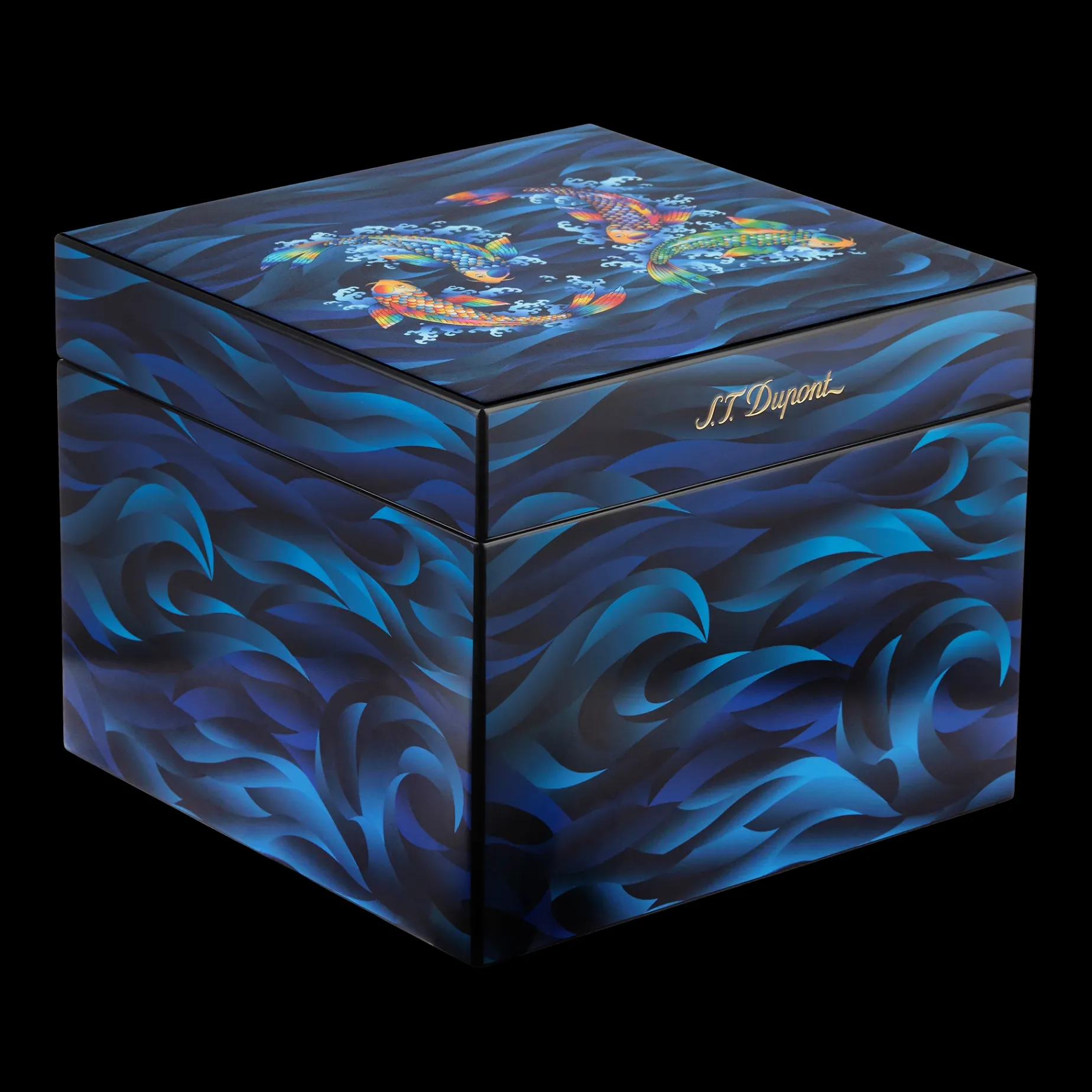 The new S.T. Dupont collection draws inspiration from Japanese woodblock prints, specifically the koi fish, a symbol of courage and perseverance. An captivating collection that pays tribute to the beauty of nature.Cube cigar humidor decorated with the koi fish motif, satin finish, and golden hinges.Boveda ref kit 087377