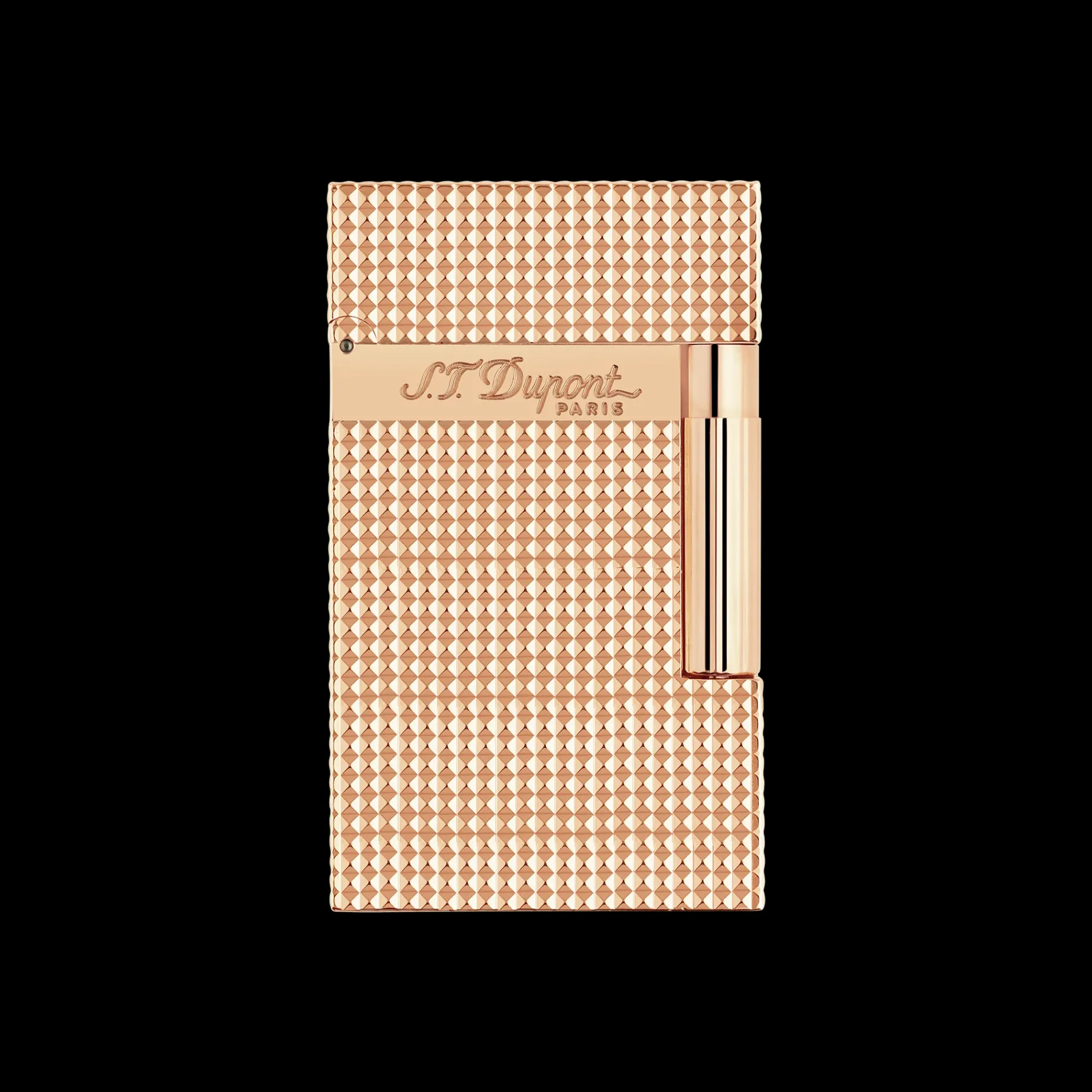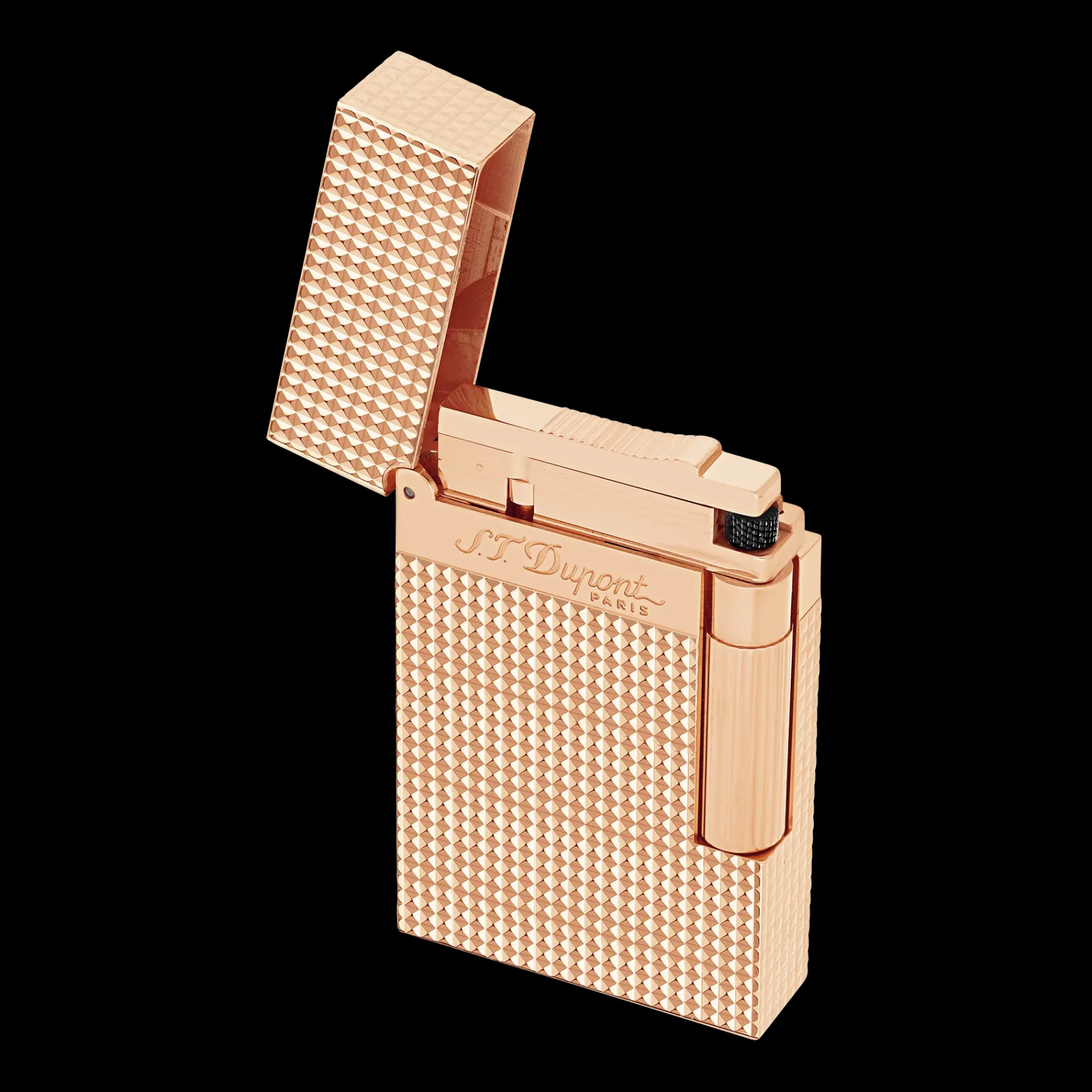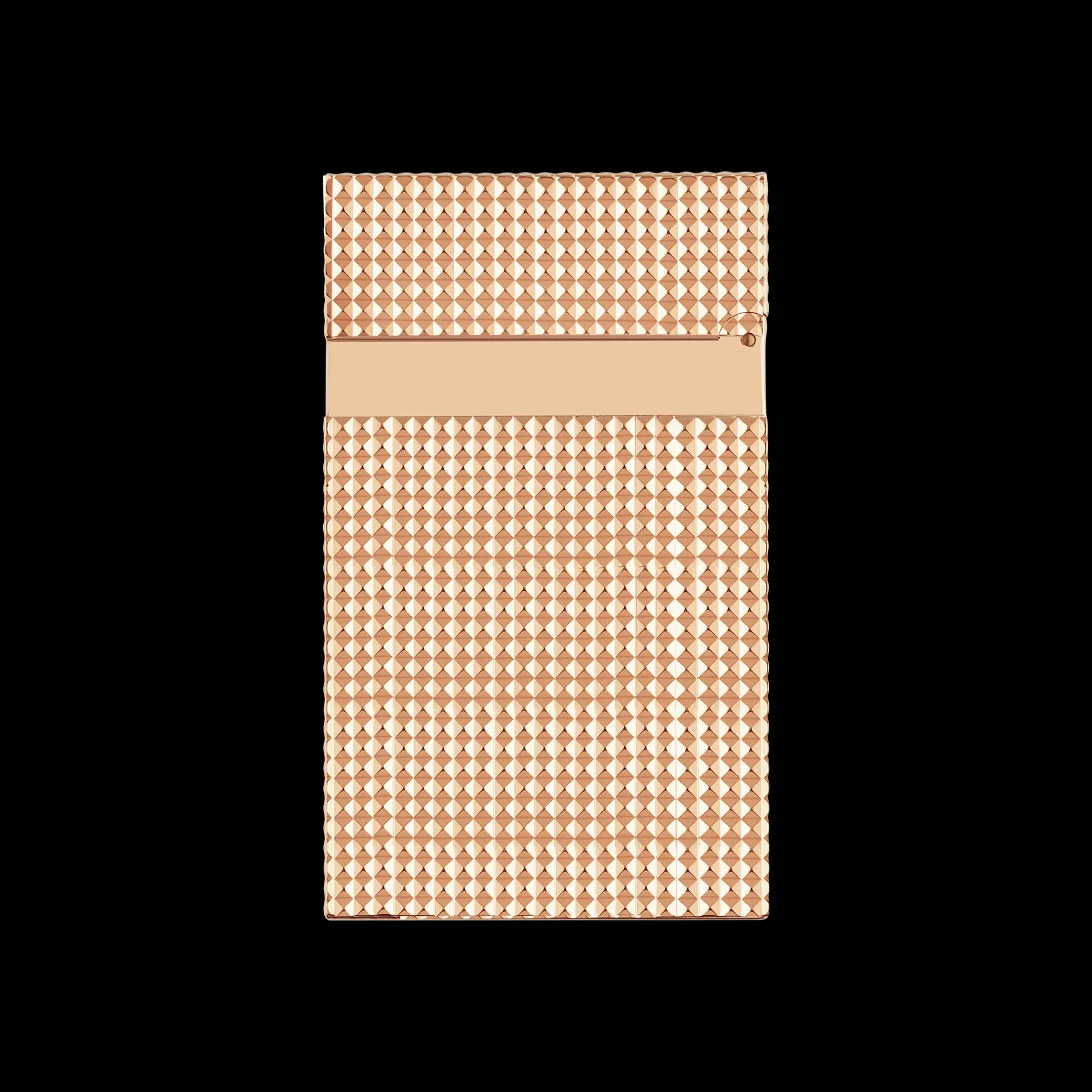 Double flame yellow lighter. Decorated with the iconic house pattern: diamond tip and plated in rose gold. Featuring the famous “Cling” when opening. Associated lighter stone: black (REF 900601). Associated gas refill: yellow (REF 900432). Lighter delivered empty of gas, refill sold separately.