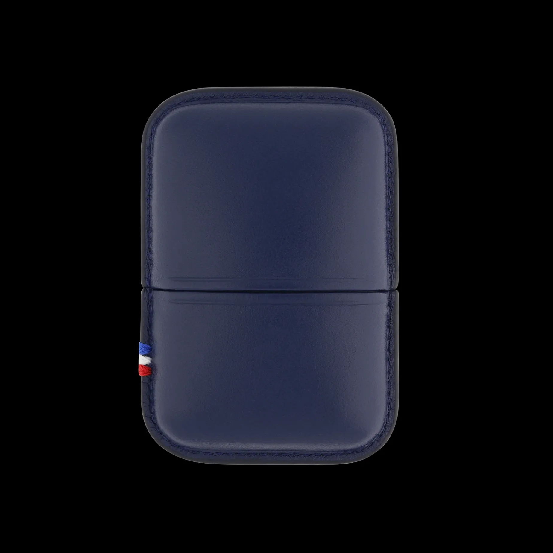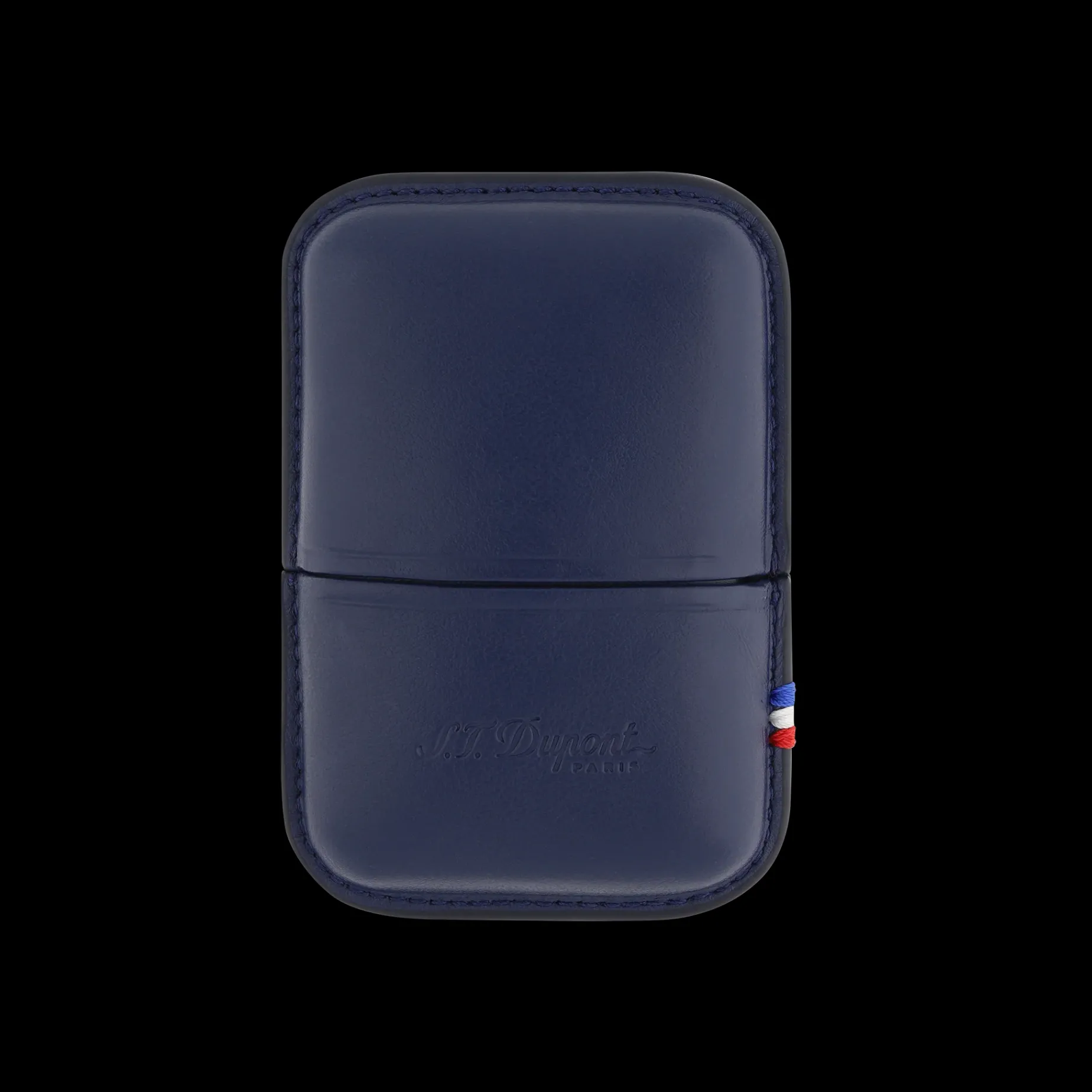 Blue smooth cowhide leather lighter case, accommodates a Line 2 lighter. Embossed with the S.T. Dupont logo and blue, white, red stitching.