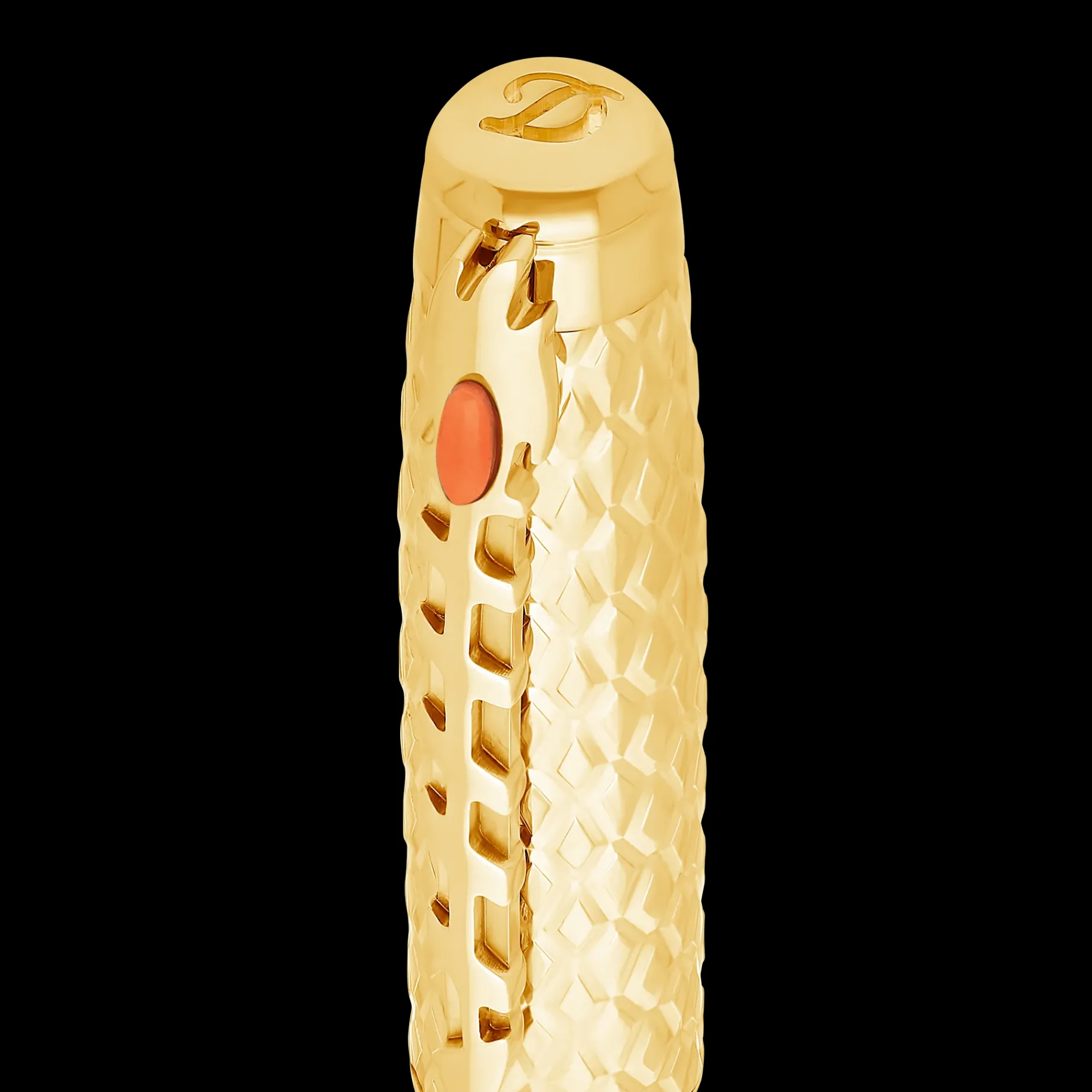 S.T. Dupont unveils an exclusive collaboration with Game of Thrones, marking the intersection of HBO’s flagship series with S.T. Dupont’s exceptional craftsmanship.The Maison has drawn inspiration from the rich and complex world of Game of Thrones to design three distinct collections, each inspired by the essential symbols of the series. The Throne, representing supreme power in the world of Westeros, the Fire and Ice Dragons, iconic figures in the series, and finally, the Noble Houses, the true pillars of the intrigue, all feature their emblems in a sublime and prestigious manner on unique creations.Line D Eternity large ballpoint pen with orange dragon scale guilloché under lacquer and gold finishes. Cap adorned with dragon scale guilloché craftsmanship. Clip shaped like the Catspaw dagger. Available in ballpoint, rollerball, and fountain pen versions. Made in our workshops in Faverges, France. Associated refills: 040853 Blue – 040854 Black – 040358 Pink – 040359 Red – 040360 Green – 040361 Turquoise.