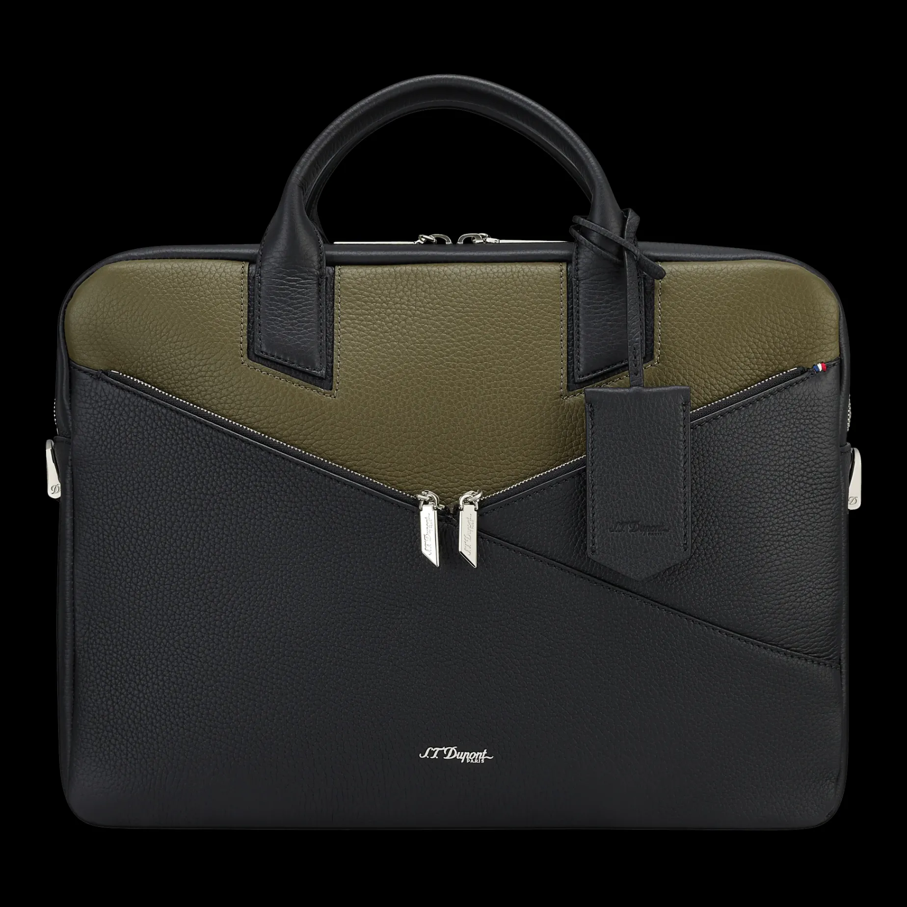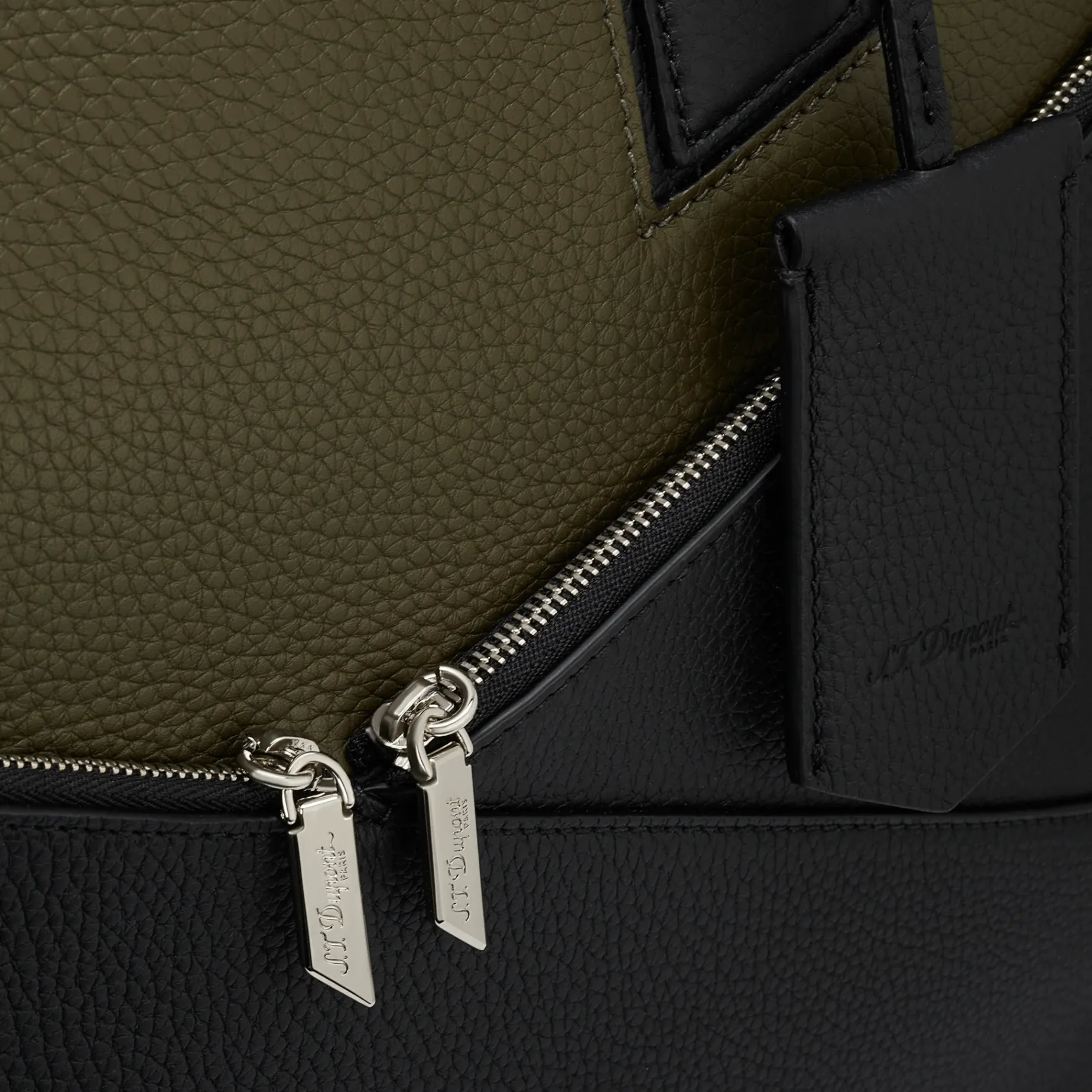 Neo Capsule Document Holder. Grained bicolor calf leather in khaki green and black. Spacious interior: it can hold A4 documents, an iPad or a laptop, as well as a multitude of other items. All products from the grained Neo Capsule collection are LWG certified.
