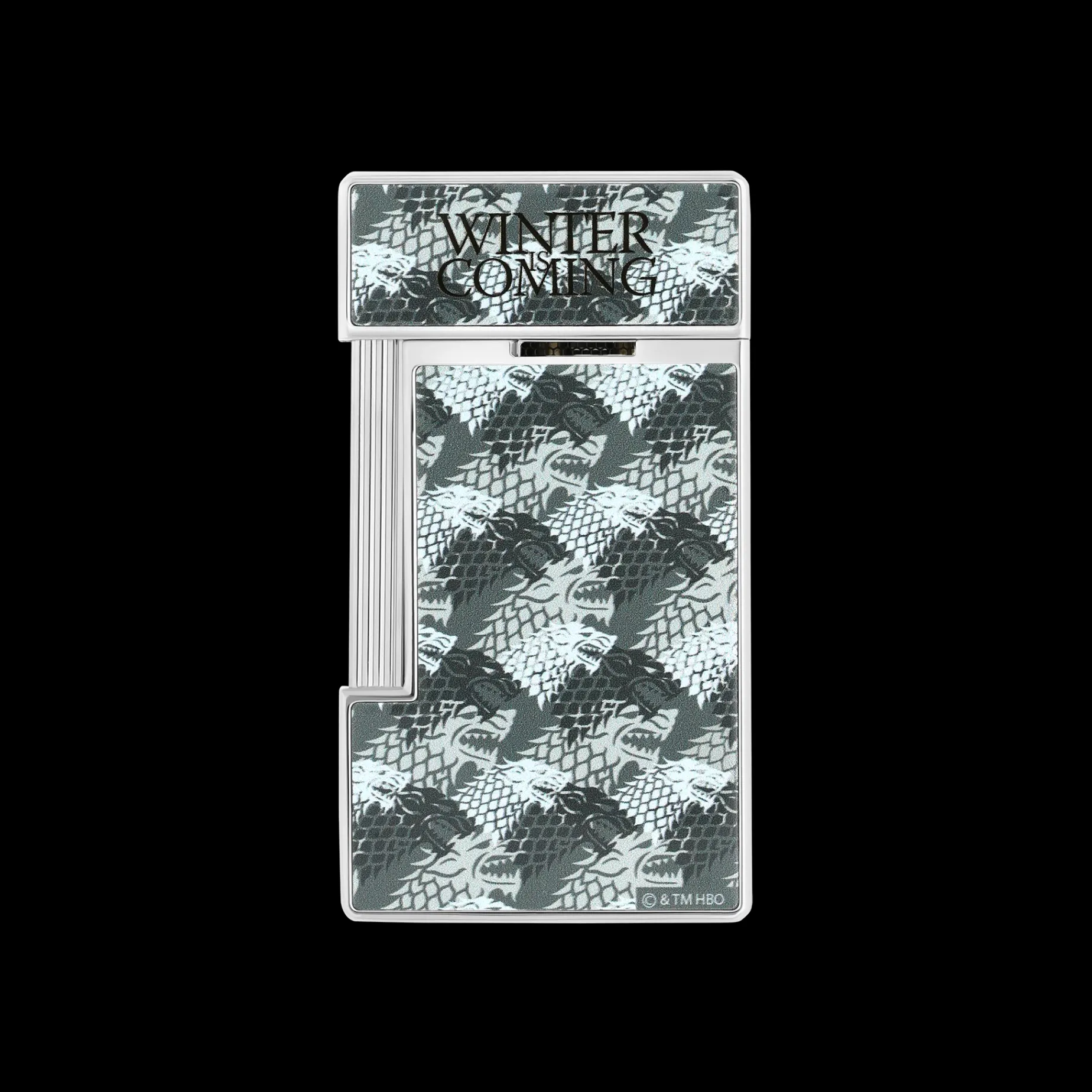 S.T. Dupont unveils an exclusive collaboration with Game of Thrones, marking the convergence of HBO’s flagship series with S.T. Dupont’s exceptional craftsmanship.The Maison has drawn from the rich and complex world of Game of Thrones to create three distinct collections, each inspired by the series’ essential symbols. The Throne, symbolizing supreme power in the world of Westeros, the Fire and Ice Dragons, iconic figures in the series, and finally, the Noble Houses, the true pillars of the plot, have their emblems exquisitely adorned on unique and prestigious creations.Slimmy lighter featuring the Stark House emblem, the wolf, and its motto “Winter is Coming.” Equipped with a 1 cm blue torch flame with adjustable flame. Chrome finish.Lighter is shipped without gas; refill sold separately.